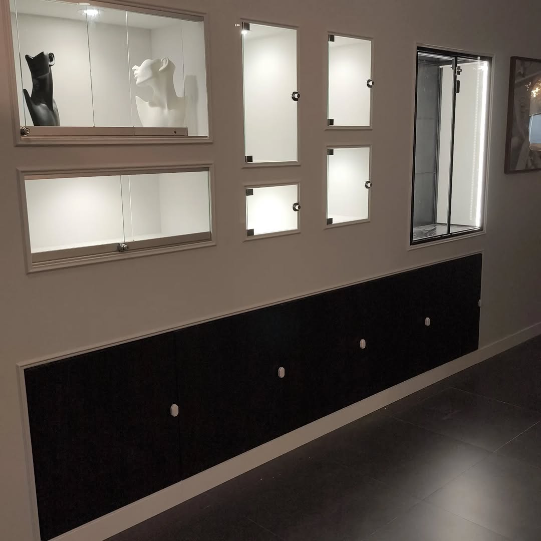 Materialidad y Orden Visual: Al pasar de un taller (donde suele reinar el caos productivo) a una tienda, el almacenaje oculto fue una prioridad. Integramos sistemas que permiten mantener el espacio despejado, garantizando que el cliente perciba orden, control y profesionalidad absoluta.